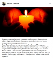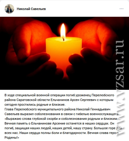 О гибели Арсена Ельчанинова рассказал глава Перелюбского района Николай Савельев.
