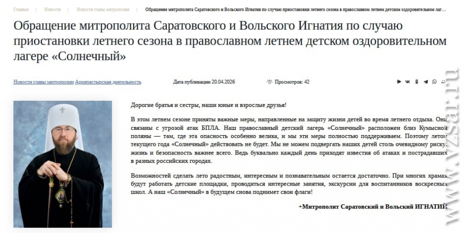 Митрополит сделал заявление об атаках БПЛА и саратовском лагере "Солнечный"