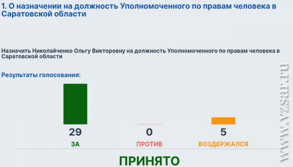 В итоге за кандидатуру Николайченко проголосовали 29 депутатов, а 5 парламентариев воздержались (против никого не было).