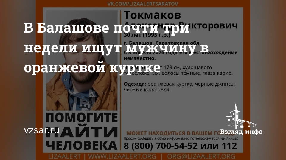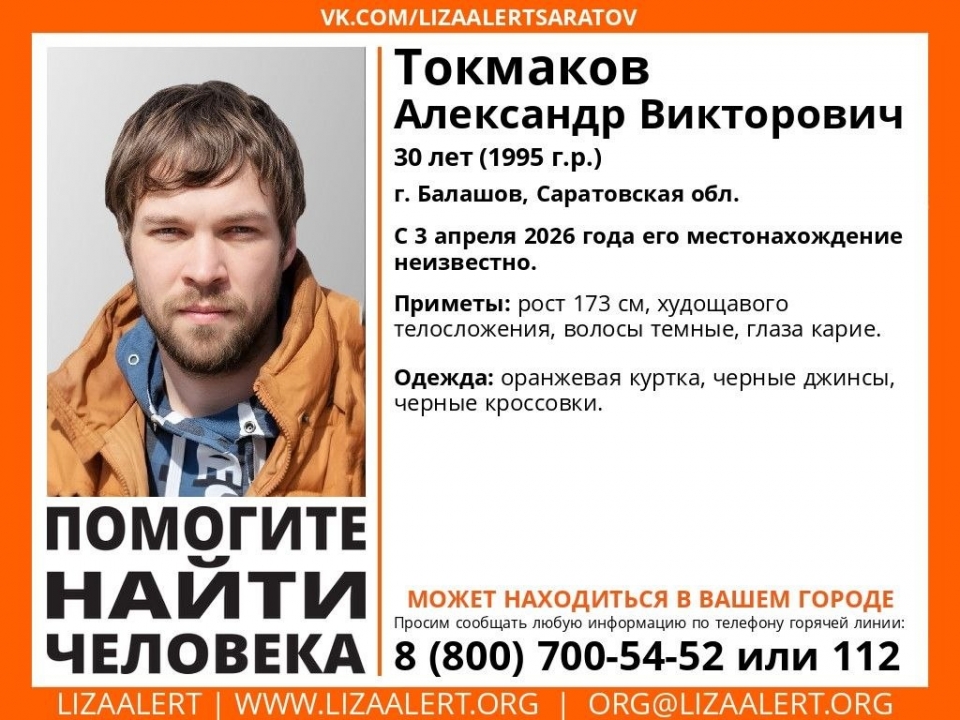 Почти три недели назад в Балашове пропал 30-летний Александр Токмаков, сообщил вчера вечером поисковый отряд "Лиза Алерт Саратов".