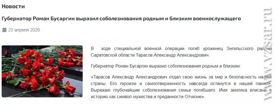 Администрация Энгельсского района без подробностей сообщила о гибели Александра Тарасова.