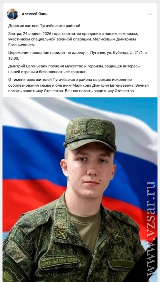 Глава Пугачевского района Алексей Янин рассказал, что завтра в городе пройдет прощание с Дмитрием Маликовым.