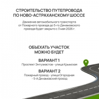 Временное ограничение движения транспортных средств, кроме задействованных в строительстве путепровода через железнодорожные пути на км 3+500 дороги Ново-Астраханское шоссе (от ул. Политехнической до поворота на Кумысную поляну), на участке км 3+028 – км 4+261 вводится с 21 мая 2026 года по 13 декабря 2027 года.