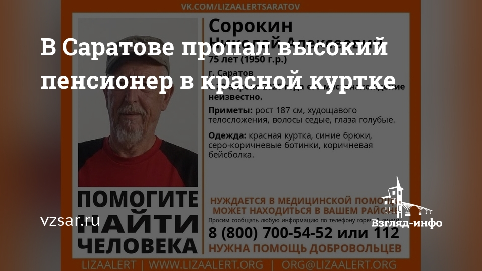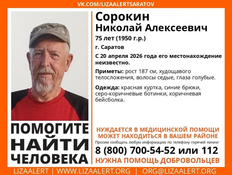 В Саратове пропал 75-летний Николай Сорокин. Об этом сообщает поисковый отряд "Лиза Алерт Саратов".