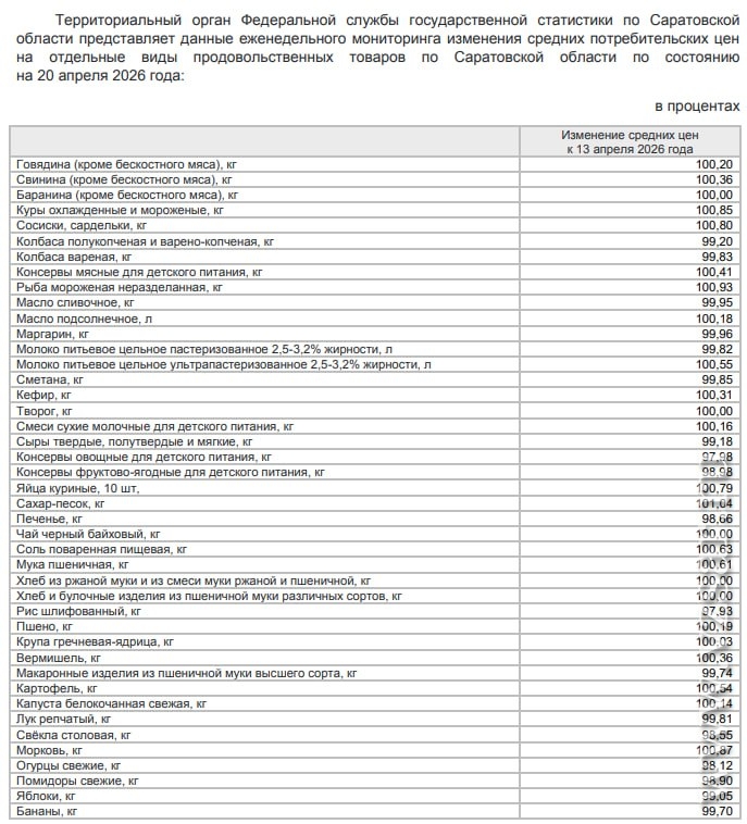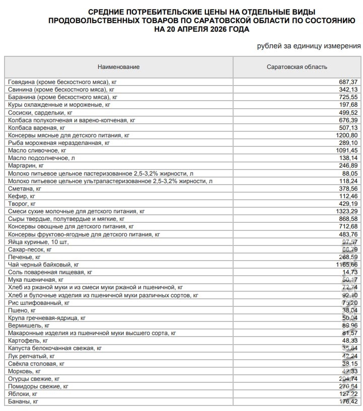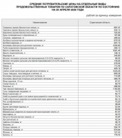 На 20 апреля средняя цена сахара-песка в регионе составляла 66,79 руб./кг, муки – 50,17 руб./кг, десятка яиц – 97,57 руб., масла подсолнечного – 138,14 руб./л, масла сливочного – 1091,45 руб./кг, сметаны – 378,56 руб./кг, кур охлажденных и мороженых – 197,68 руб./кг, капусты – 35,84 руб./кг, свеклы – 38,15 руб./кг, лука – 42,24 руб./кг, картофеля – 48,33 руб./кг, макарон – 81,57 руб./кг, огурцов – 204,74 руб./кг, помидоров – 270,64 руб./кг, бананов – 176,42 руб./кг.