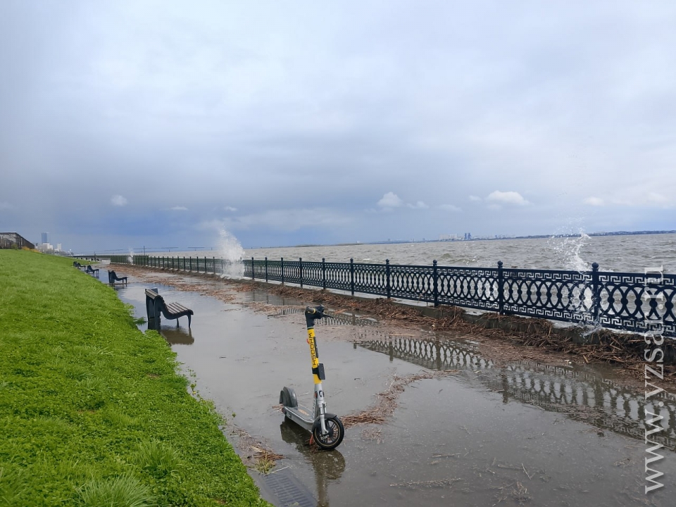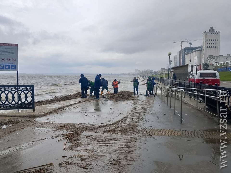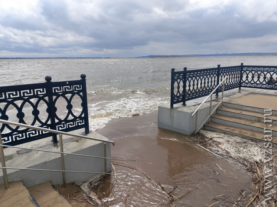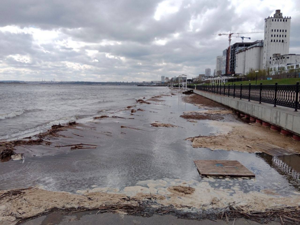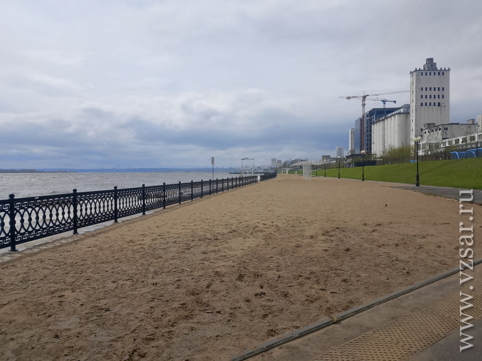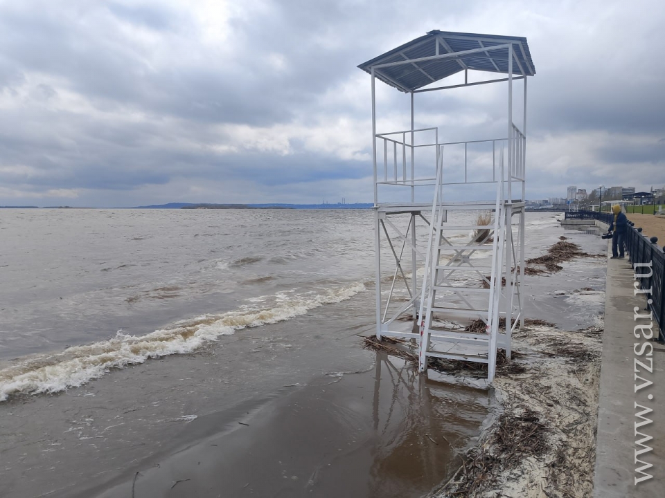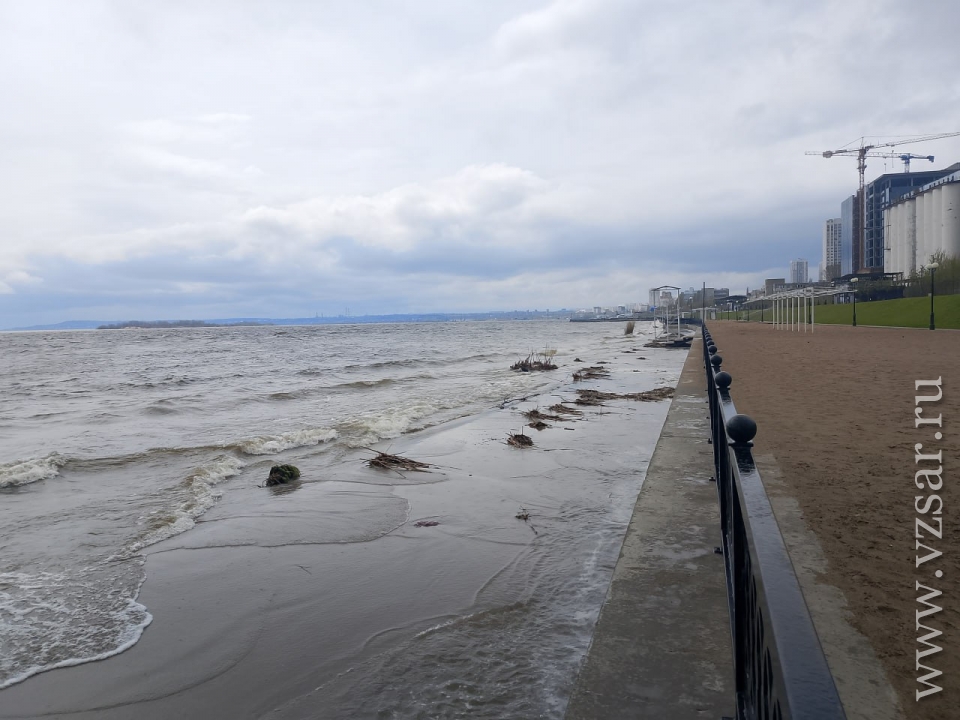 Сегодня на пляже идут мероприятия по уборке принесенного разлившейся рекой мусора. На фотографиях также можно увидеть, что волны Волги достают до забора у пешеходной зоны набережной, а вода уже подтапливает территорию возле скамеек.