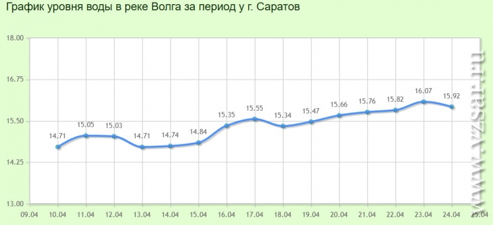 Так, 10 апреля уровень воды в Волге в районе Саратова, по данным ФБУ "Администрация Волжского бассейна" и Росгидромет ФГБУ "Приволжское УГМС", находился на отметке в среднем 14,71 метра, а вчера - 16,07 метра. Сегодня среднее значение фиксируется в 15,92 метра.