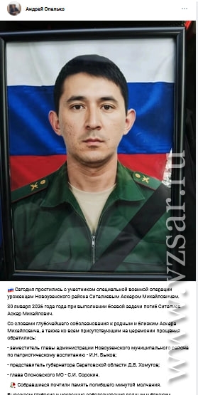 В Новоузенском районе сегодня простились с Аскаром Ситалиевым, погибшим 30 января этого года при выполнении боевой задачи. Об этом сообщил глава муниципалитета Андрей Опалько.