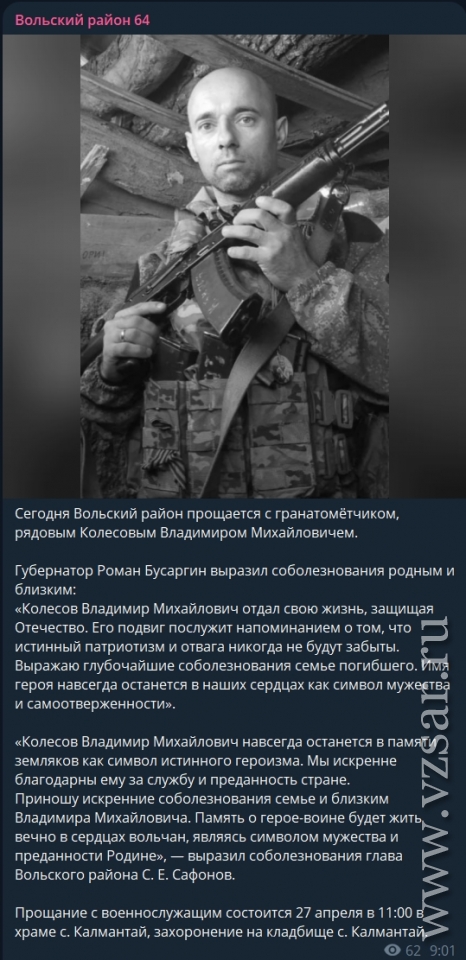 Администрация Вольского района рассказала о прошедшем сегодня в селе Калмантай прощании с гранатометчиком, рядовым Владимиром Колесовым.