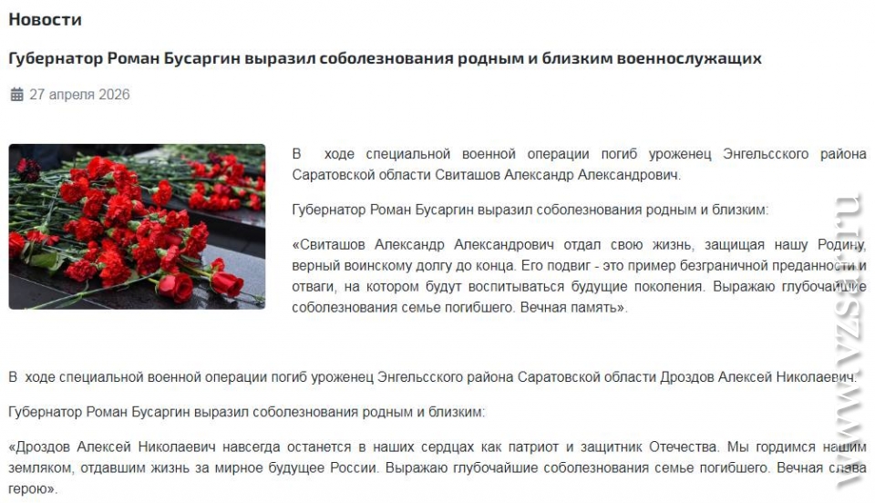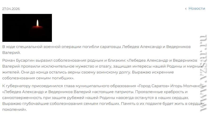 Администрация Саратова без подробностей сообщила о гибели Александра Лебедева и Валерия Ведерникова, а администрация Энгельсского района – о гибели Александра Свиташова и Алексея Дроздова.