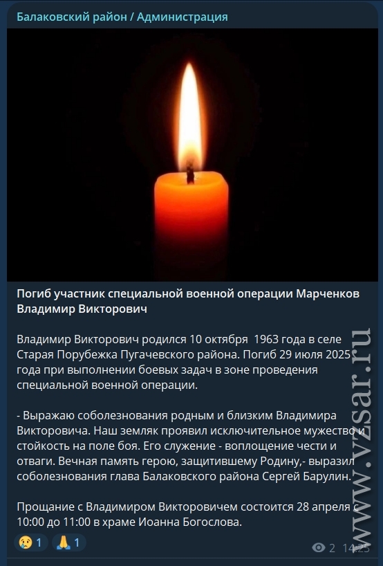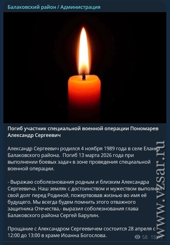 Также администрация Балаковского района рассказала, что завтра пройдет прощание с Александром Пономаревым и Владимиром Марченковым.