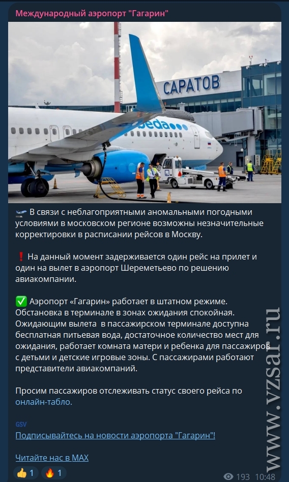 В международном аэропорту "Гагарин" задерживаются рейсы из Москвы и Санкт-Петербурга, сообщает тг-канал авиагавани.