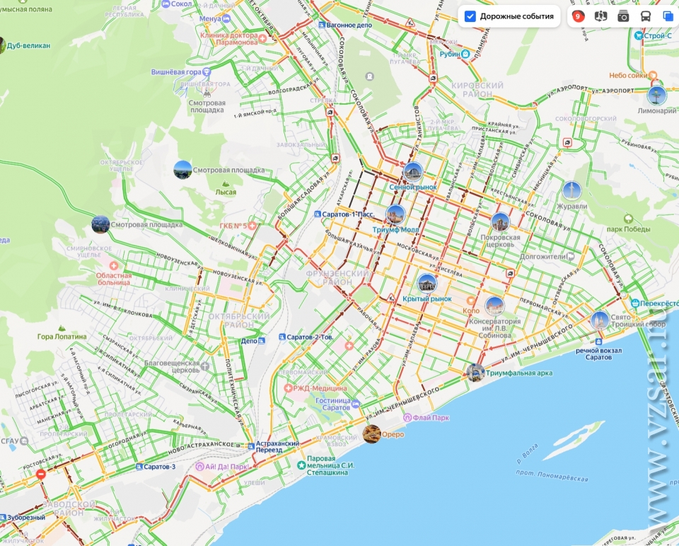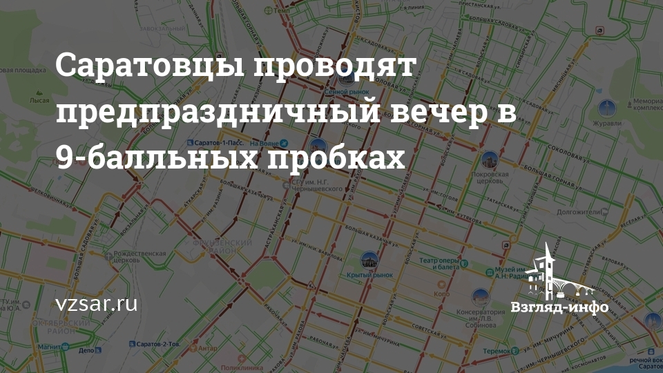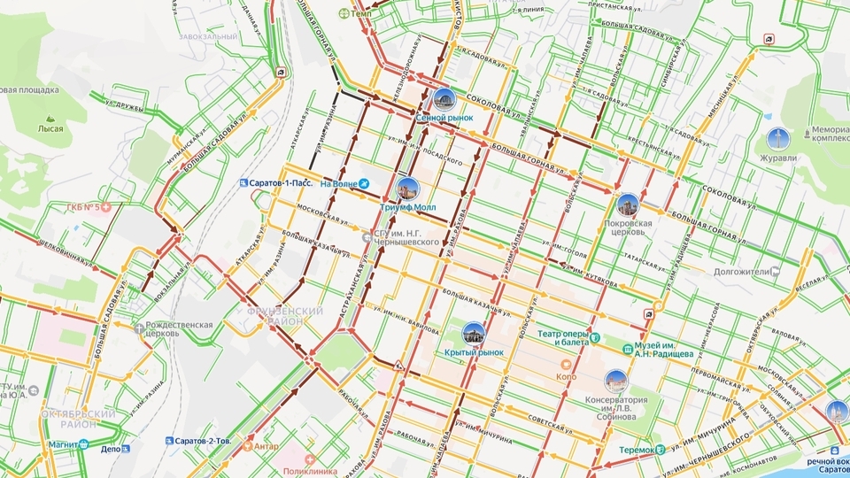 Канун праздничных дней саратовцы перемещаются по городу через серьезные дорожные заторы. Сервис "Яндекс.Пробки" оценивает ситуацию в городе на 9 баллов из 10.