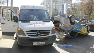 В центре Саратова при столкновении с маршруткой перевернулось такси