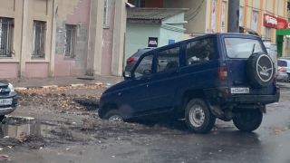 На улице Хользунова внедорожник "нашел" дыру в асфальте