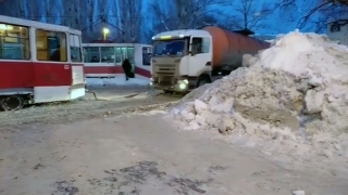 В Саратове трамвай буксировал застрявший на путях бензовоз