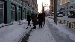 Директор и учителя лопатами чистят снег у здания саратовского лицея