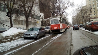 В центре Саратова трамваи стояли два часа из-за припаркованного "Volvo"