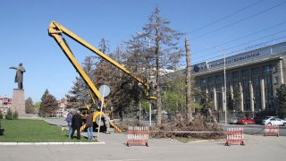 На Театральной площади спиливают ели