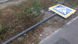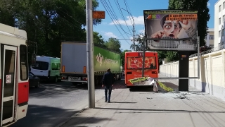 Автобус разбил рекламный щит на тротуаре в центре Саратова