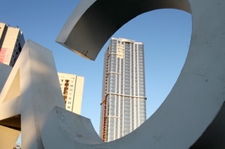 Бетонно-стеклянное сооружение на Предмостовой площади – жилой комплекс под нежным именем "Елена" – строители гордо называют зданием, входящим в десятку самых высоких в стране.